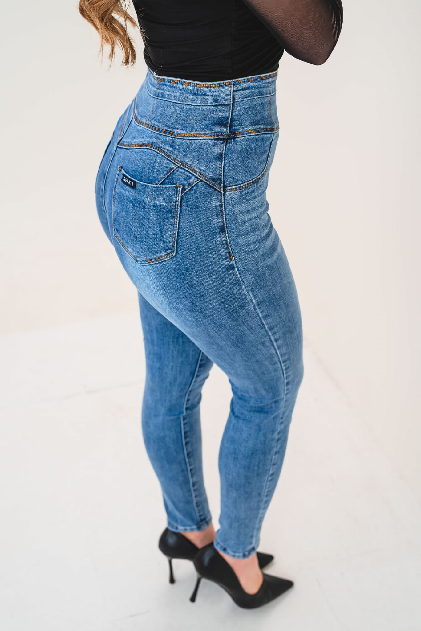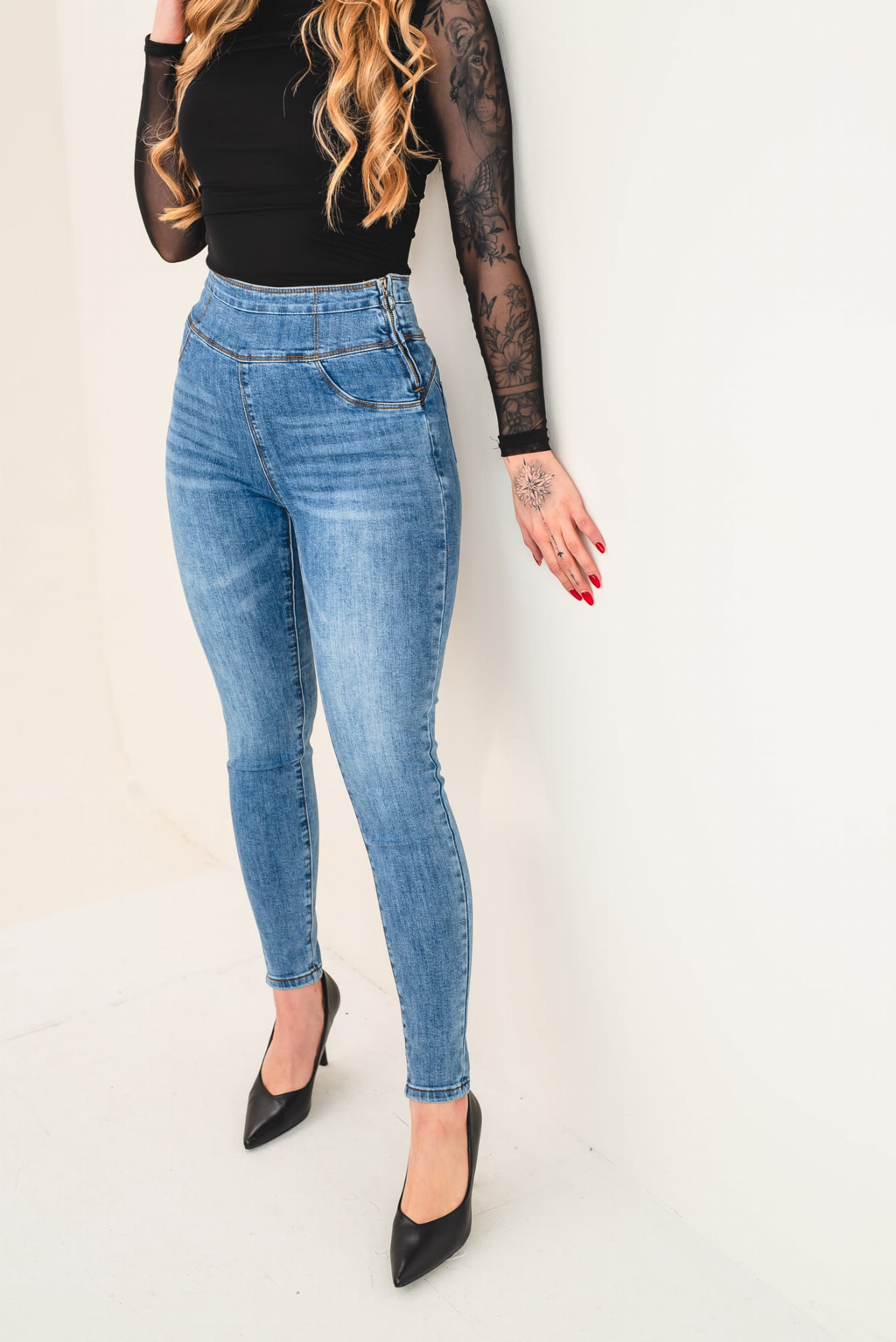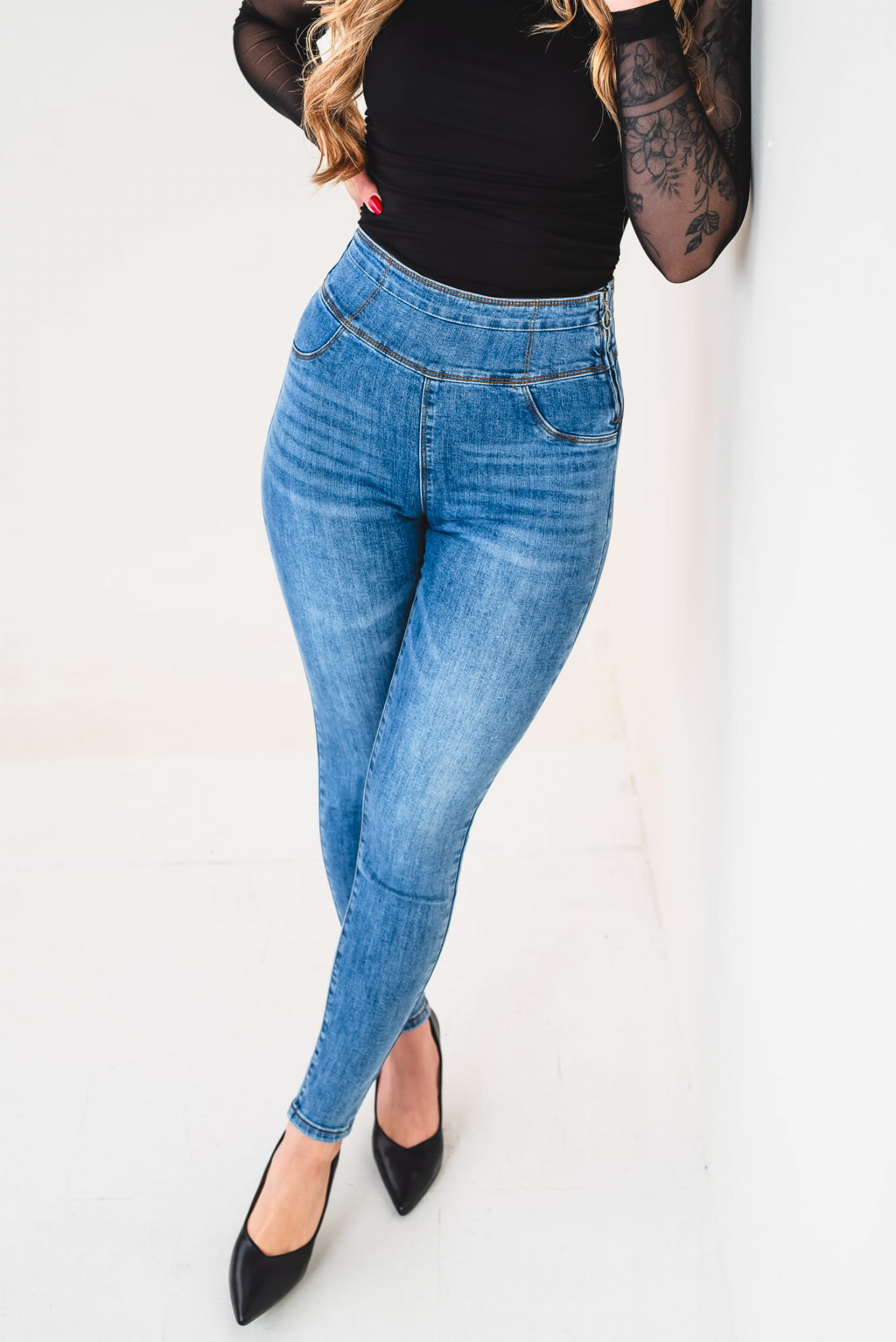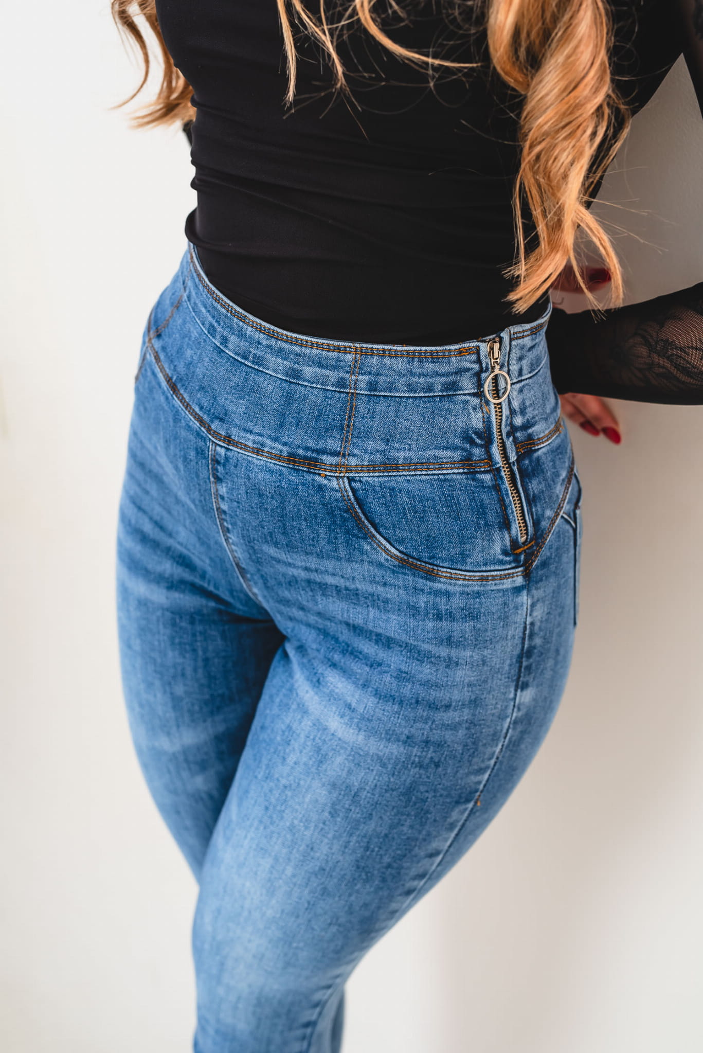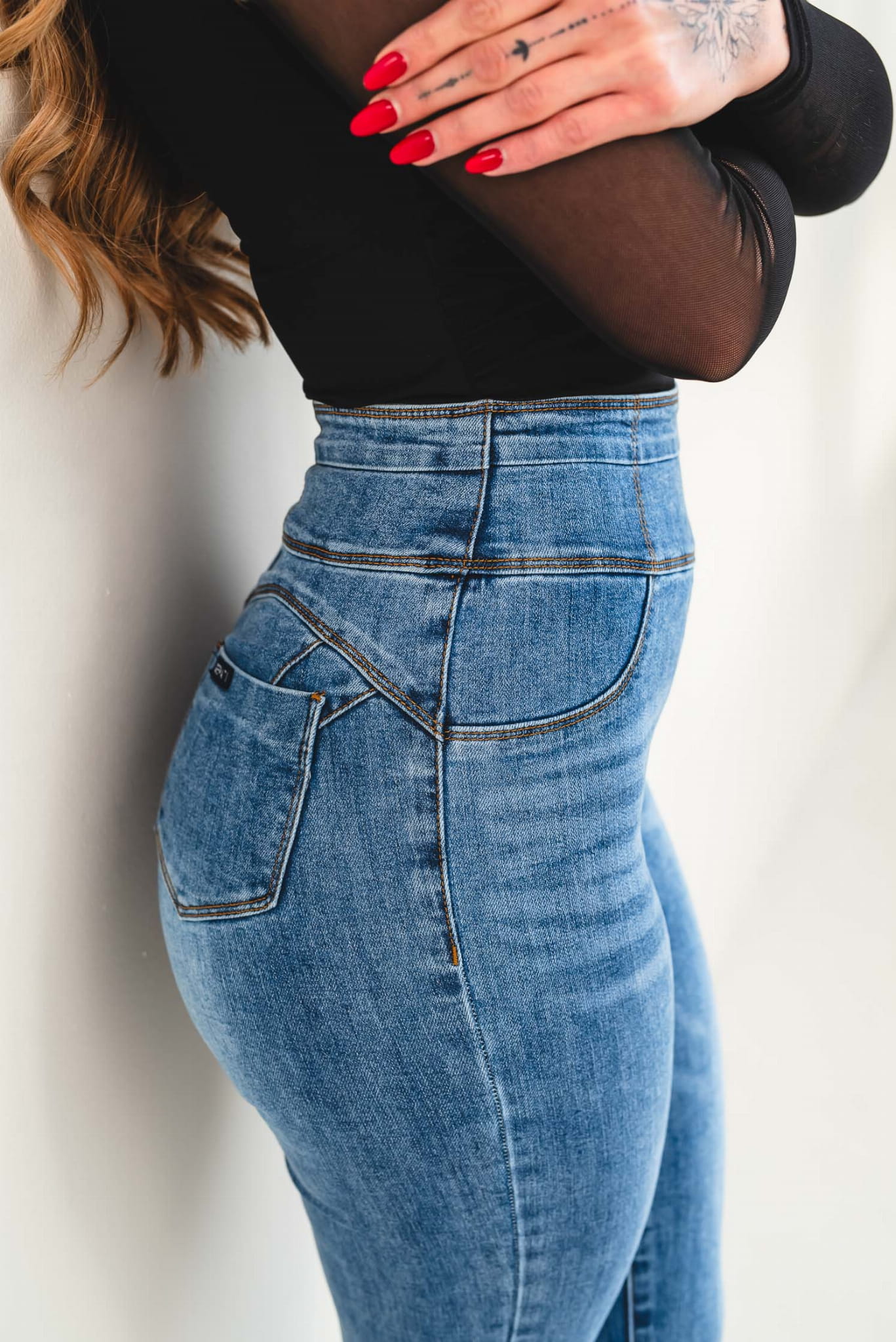- Materiał: elastyczny denim premium – trwały, wygodny i elastyczny